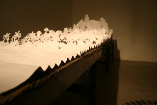 From these thoughts, i began my work on a single scroll beacuse am talking about a continues evolution without boundaries than a page by page formats.......and since i am talking about landscape, the idea was to carve out a landscape from the scroll.... so the concept is from the side view, where its like a pulse recorder. as the artwork moves towards the cityscape, the pulse gets higher and higher...
